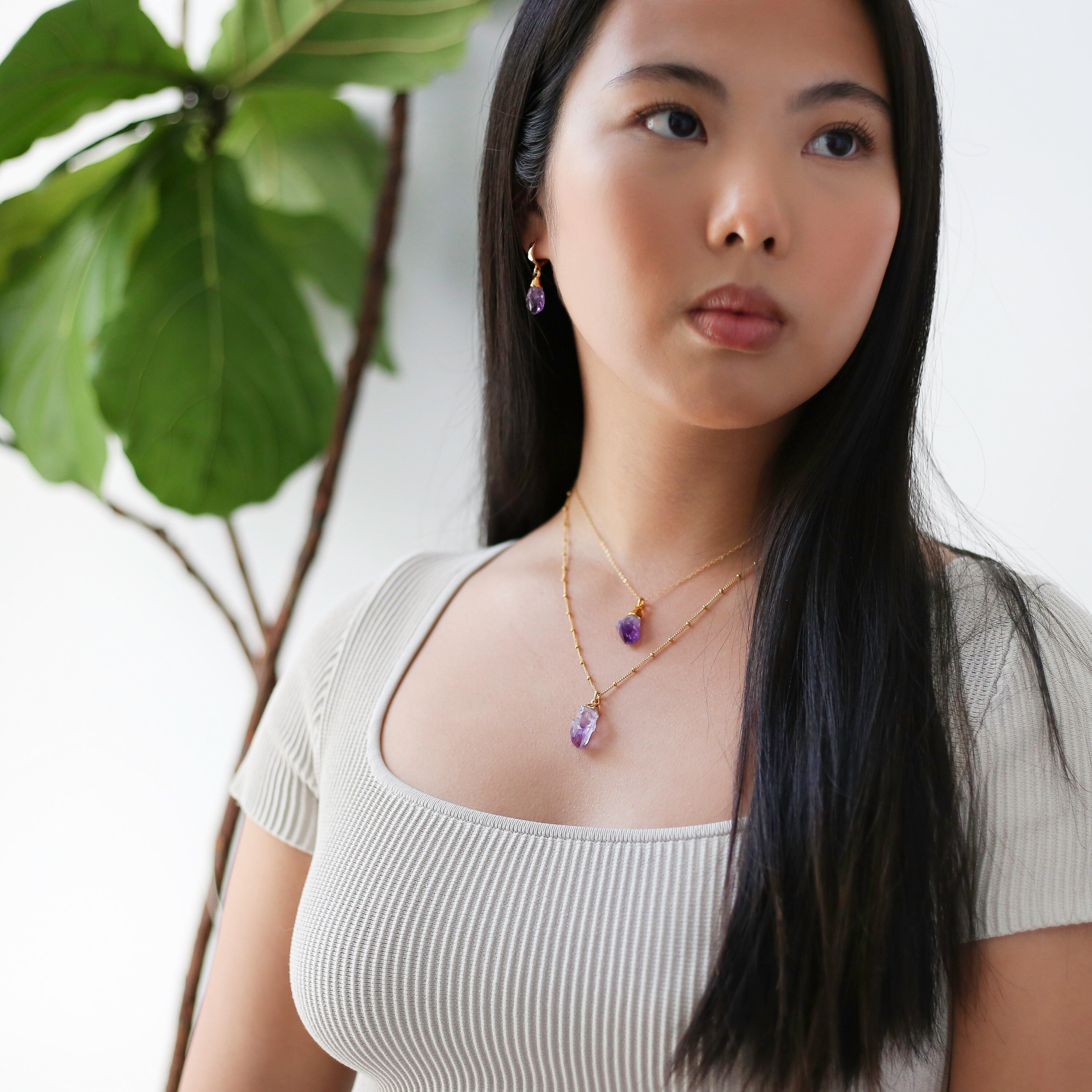 Geo Raw Amethyst Earrings • 14k Gold Filled • Non Tarnish Waterproof • Minimalist Summer Aesthetic • Edgy Daily Wear • February Birthstone