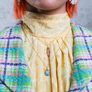 • Each stone is carefully selected and hand assembled with fine gold-filled metals, and a special paint is applied which allows electricity to run through the piece.