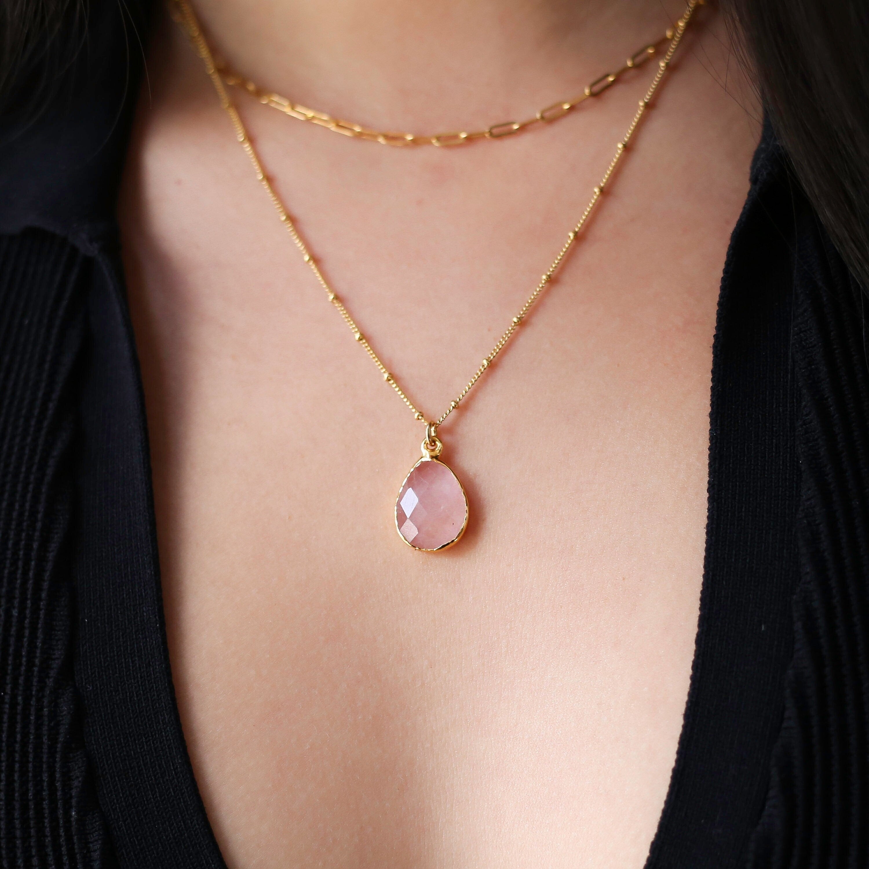 Large Tear Drop Rose Quartz Necklace with Gold Filled Paperclip Chain
